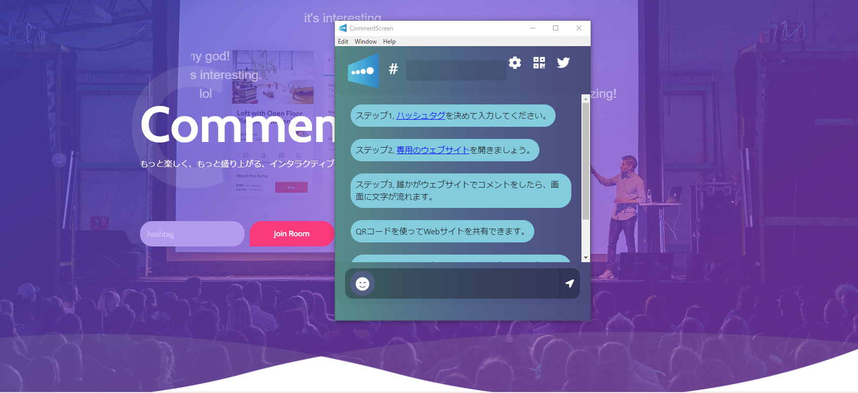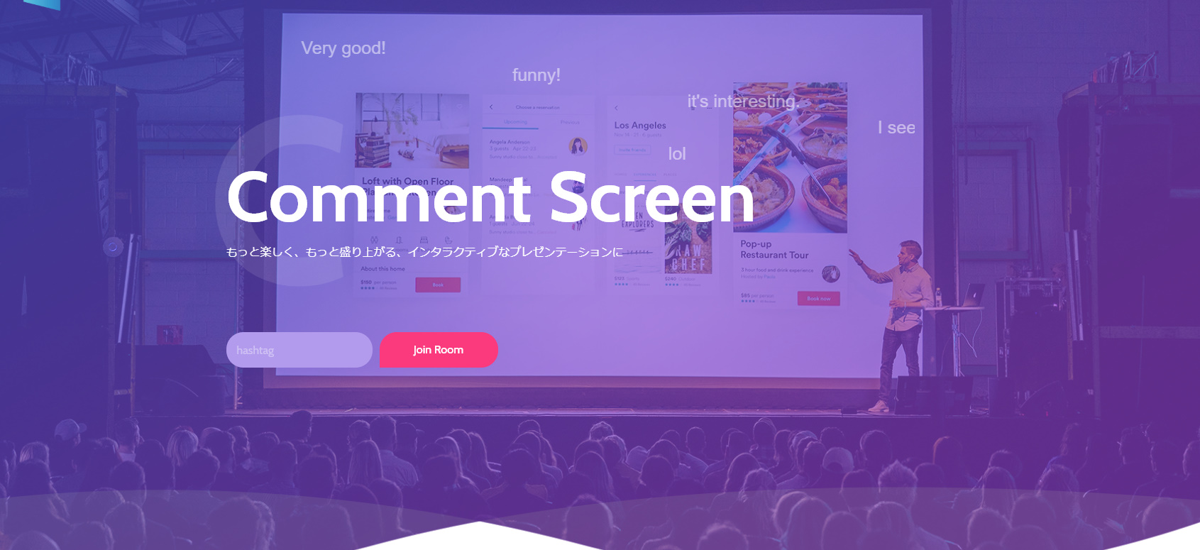 こちらのサービスを使うと、コメントが画面上にリアクションとして表現することができます。