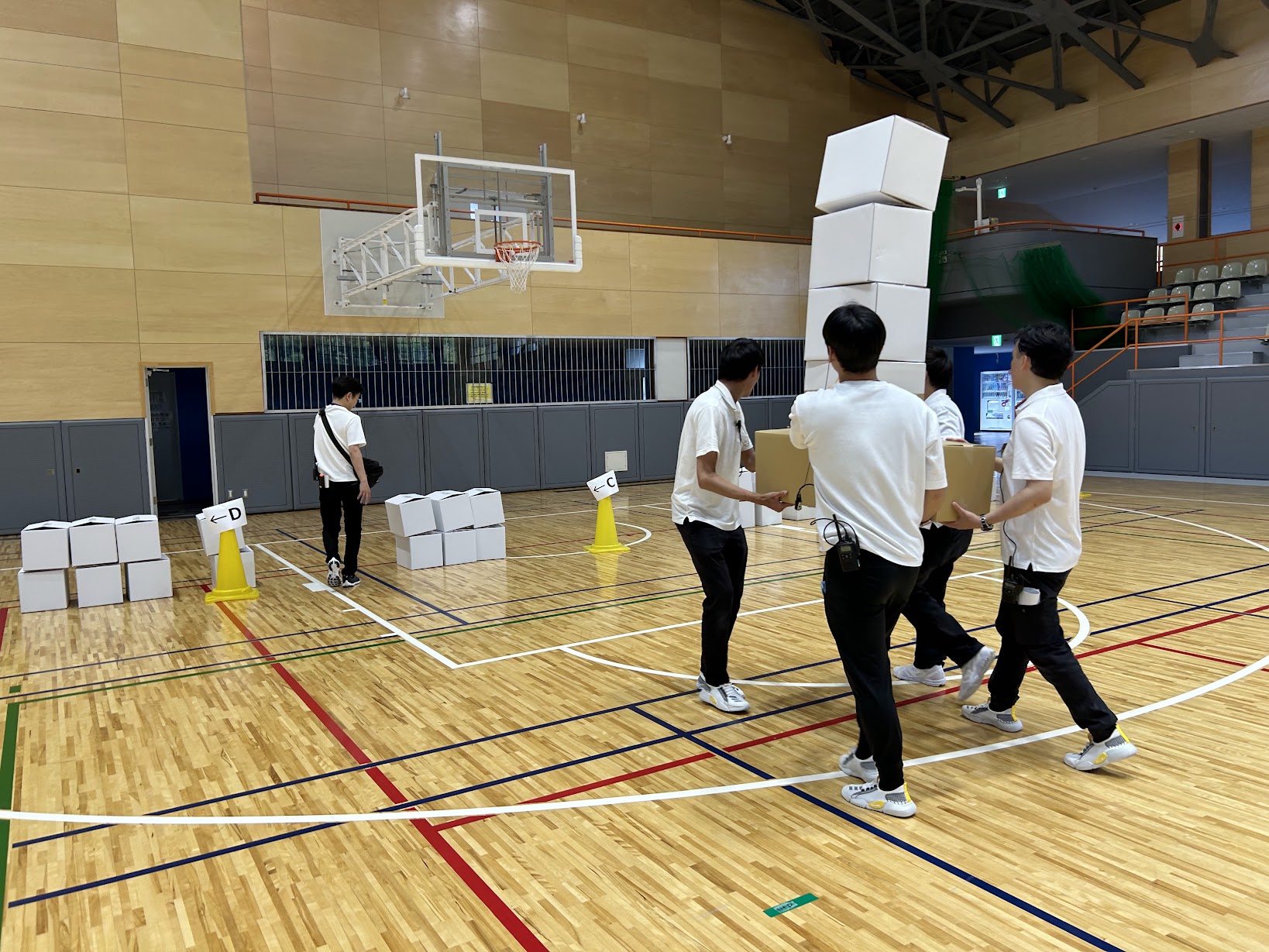 段ボールを積み上げながらリレーをするというチームワークとバランス感覚が試される企画をご用意しました。
