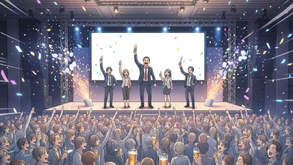例えば、1000名規模の全社総会ではLEDビジョンを使ったカウントダウン映像と、ビールサーバー隊の入場を組み合わせ、わずか30秒で会場のテンションを最高潮に引き上げました。