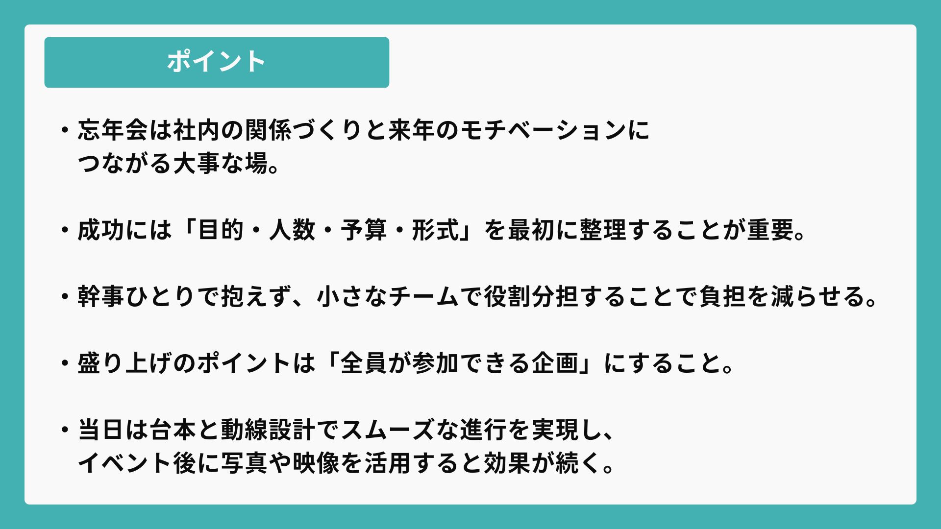 これらが揃うことで、忘年会は単なる「宴」ではなく、会社の文化や価値観が共有される場に育っていきます。