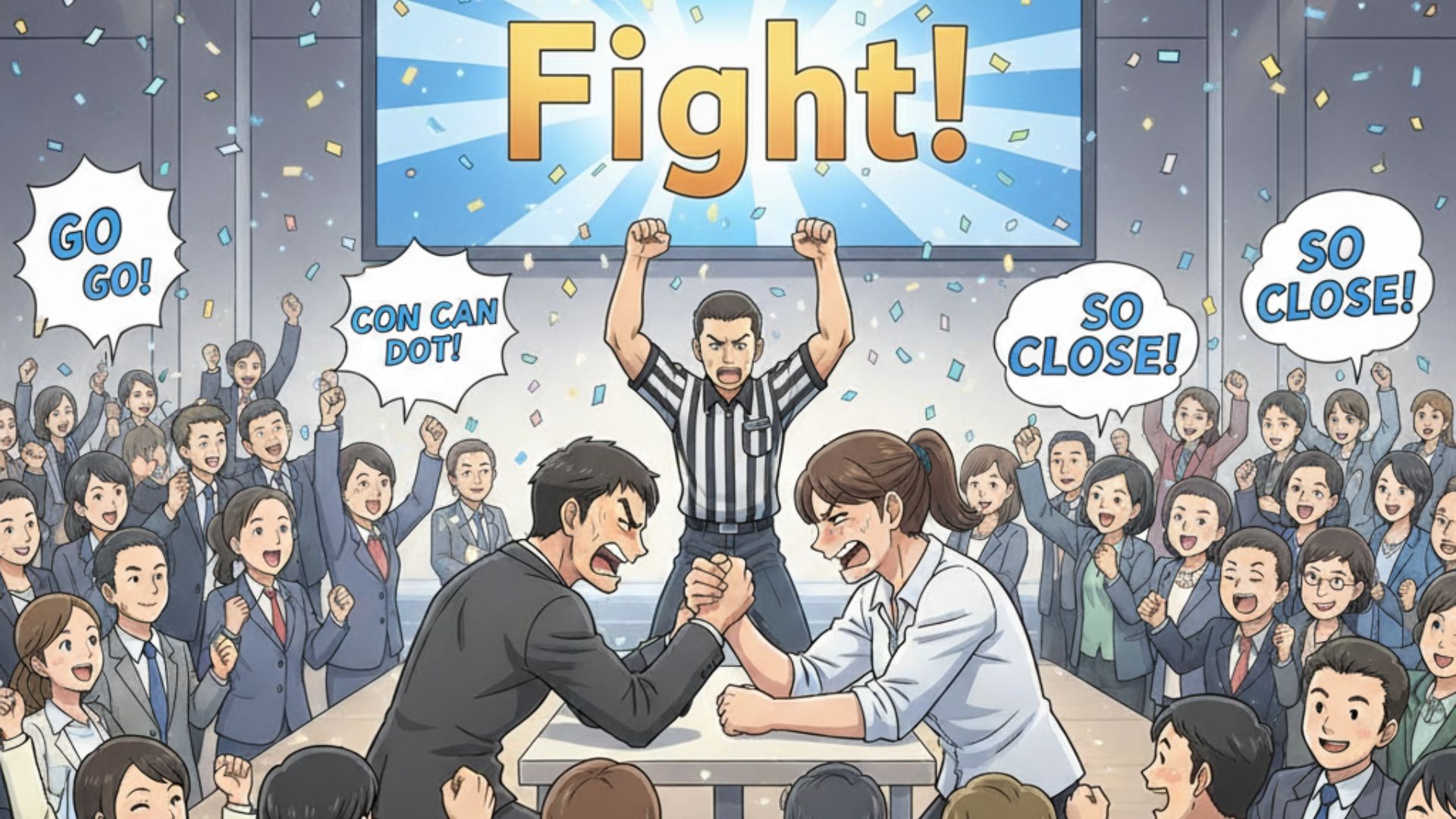 参加者が「観るだけ」ではなく「一緒に体験する」仕掛けが必要です。その中でも特に盛り上がるのが、ステージ上で社員同士が対決する参加型コンテンツです。