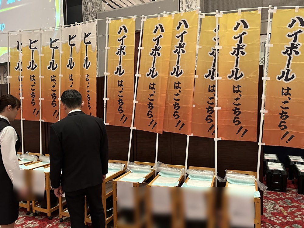 例えばの事例ですが、このようにのぼりなどを用意して盛り上げるとより会場内がにぎやかになります。広い会場内だと、どこにサーバー隊がいるかわからなくなってしまうので目印的な役割にもなりますね。