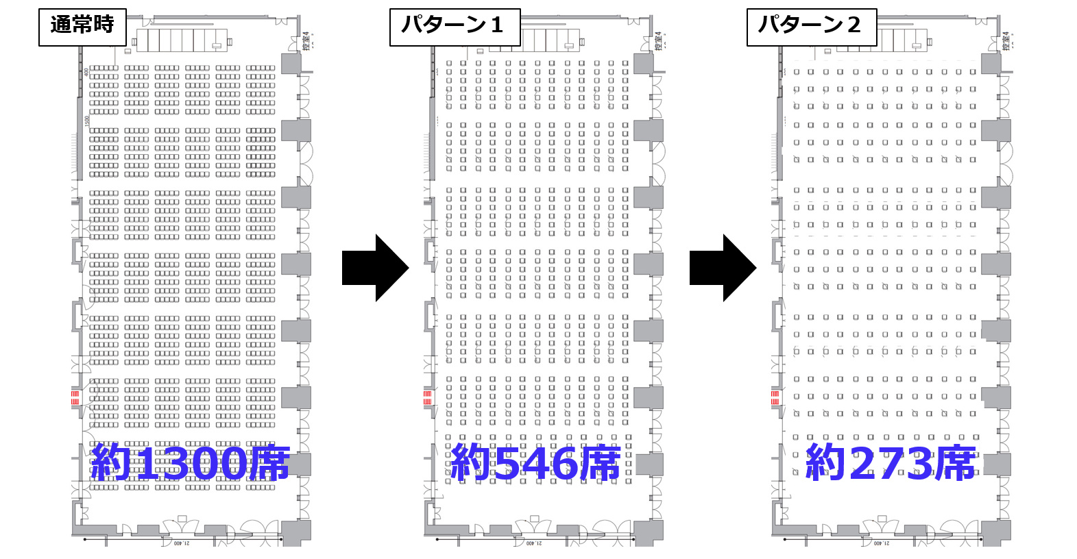 おおよそシアターで1300席の設置が可能な会場に、ソーシャルディスタンスを意識したレイアウトを作成すると図のようになります。