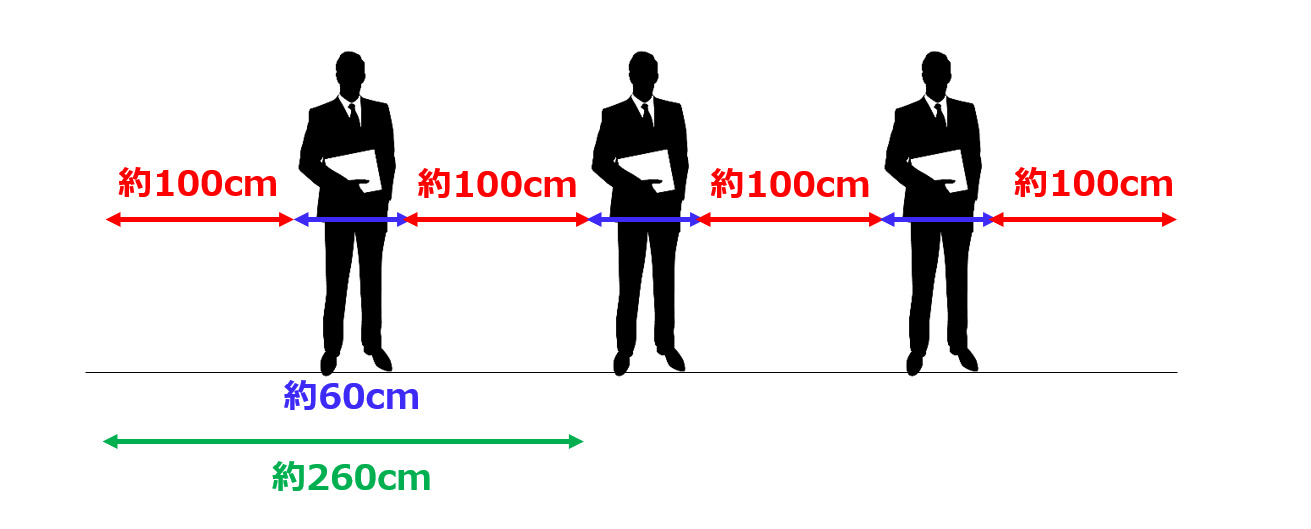 通常時は60cm~80cmくらいの幅で椅子が並んでいた場合、おおよそ4倍近くの面積が必要になってくる計算になります。