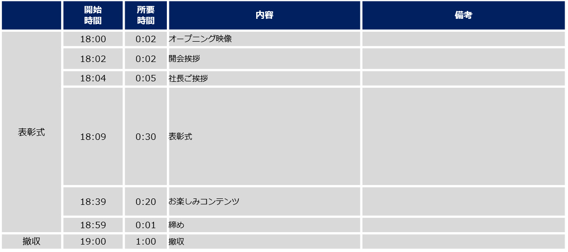 関連記事:付加価値の高いオンライン表彰式の成功のカギは進行台本。作成のポイントを実例付きでご紹介