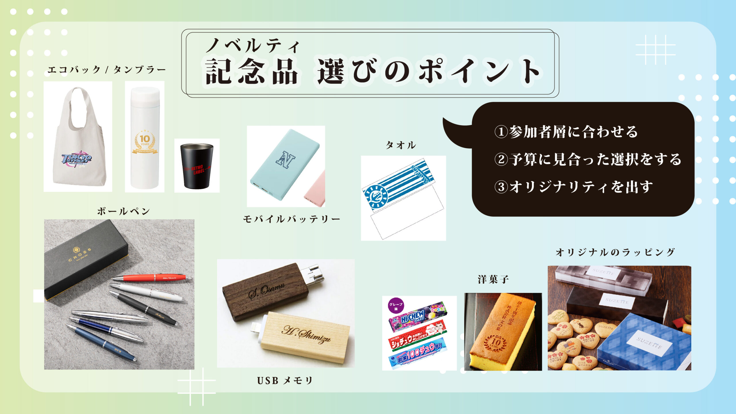 これらのポイントを押さえることで、参加者に喜ばれるだけでなく、企業の価値観や思いを伝える記念品選びが可能になります!