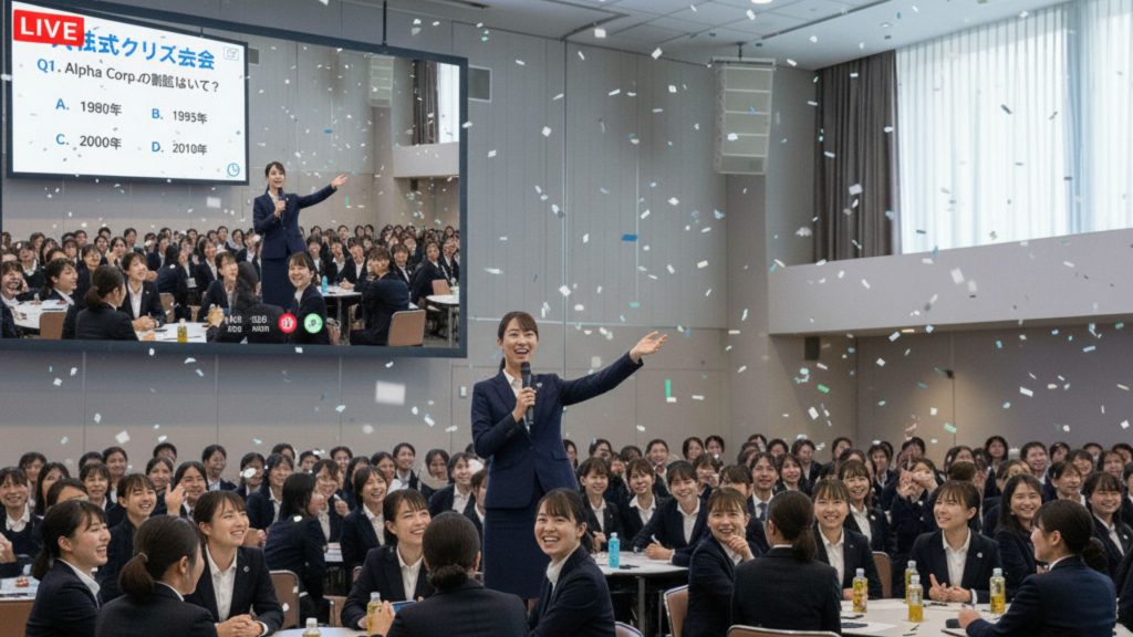 「創業年は?」「今期のスローガンは?」といった社内クイズを、オンライン投票ツールで全員参加型に。