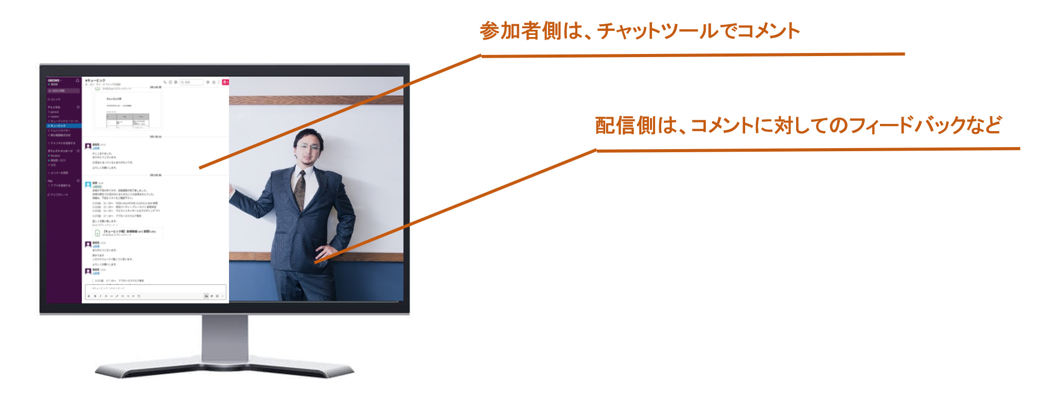 また、チャットツールなどと併用し、配信をしながら、会話をしたり、意見を求めたりなども可能です。