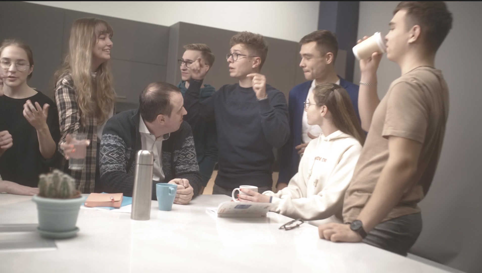 ・社長のスピーチを聞いた後の休憩中につい内容について話してしまう。