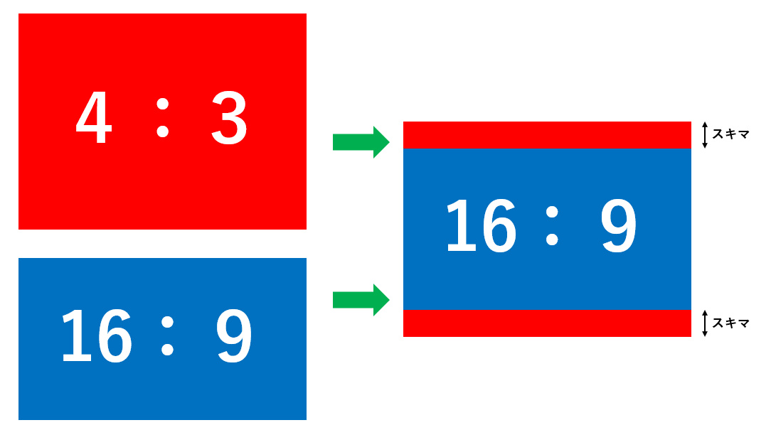 例えば、4:3サイズのスクリーンに、16:9の映像を投影した場合です。