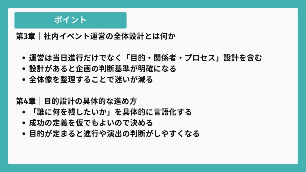 社内イベント運営は、場当たり的に進めるほど疲れます。逆に、設計が整えば、兼務でも回せる仕事になります。次章では、その第一歩である「目的設計」の具体的な進め方を掘り下げていきます。