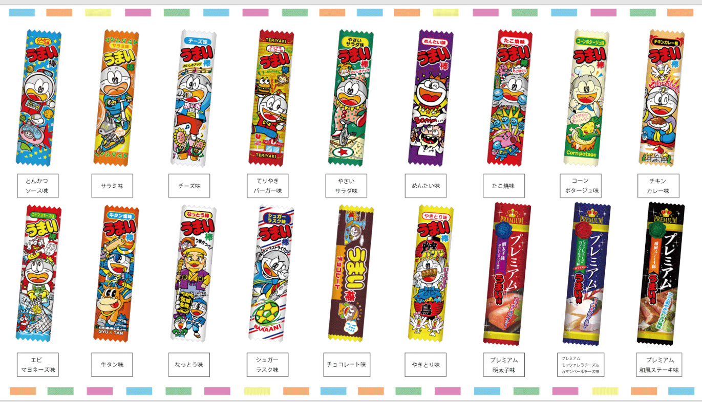 ちなみに、今回ご用意したうまい棒は、この18種類です。