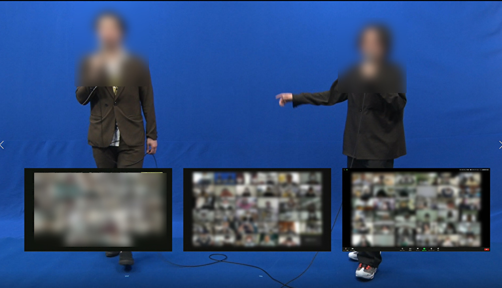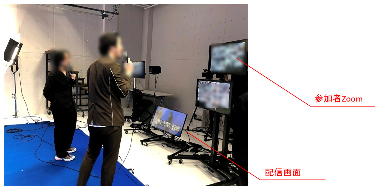 実際には、司会者の前には、Zoomの画面が並び、参加者と会話できる仕掛けとなっています。