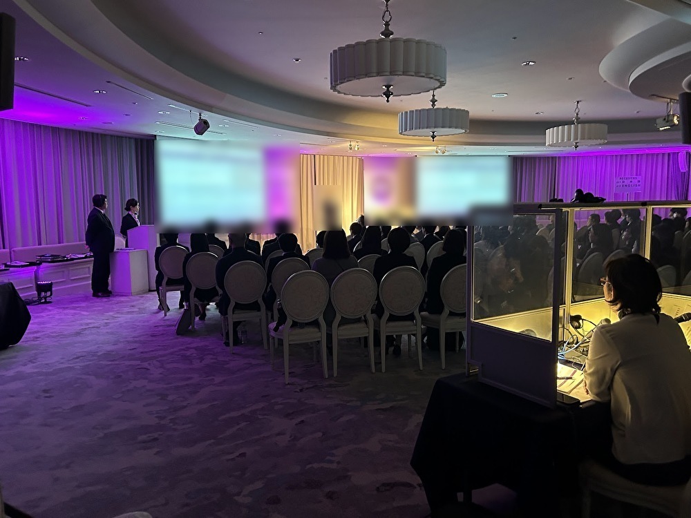 今回は、海外の方がゲストスピーカーとしてご登壇されていため、同時通訳を用意ししました。会場後方にブースを設置し、必要な方には同日通訳音声を送る対応をしています。
