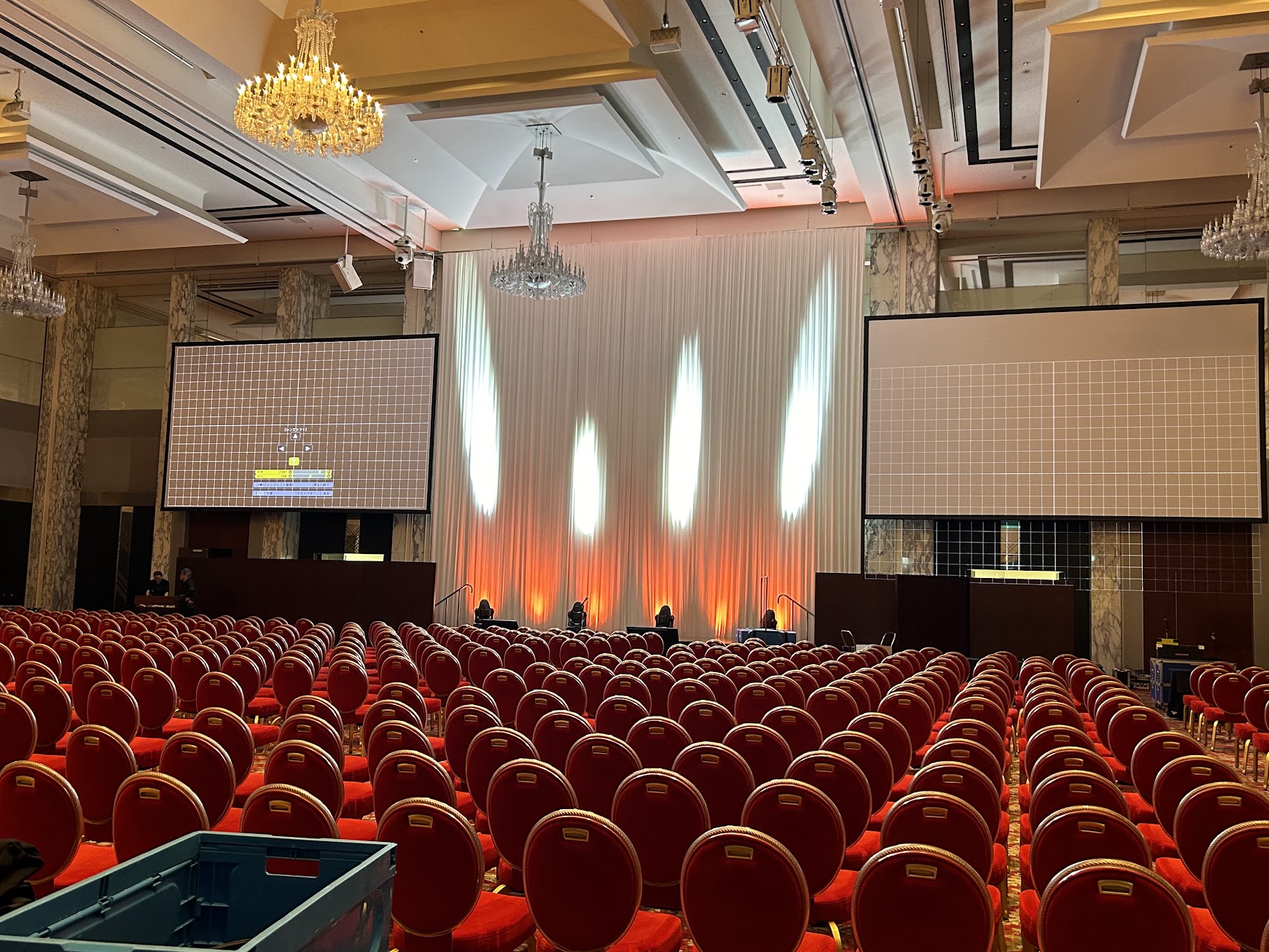 今回のイベントは、前日?(当日の)深夜からの仕込みとなりました。深夜01;00スタッフはホテルに集合。各所の仕込みが始まりました。映像チーム・照明チーム・音響チームとそれぞれのチームが協力し合い夜通しになってしまいましたが、クライアントの皆様に喜んでいただこうと一生懸命準備をしました。