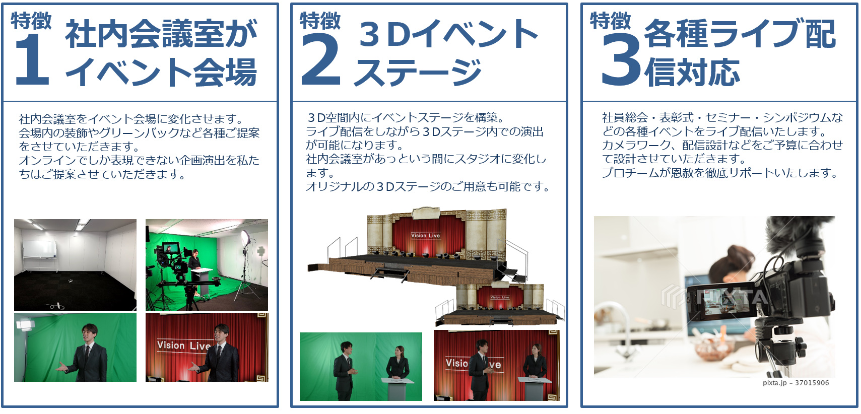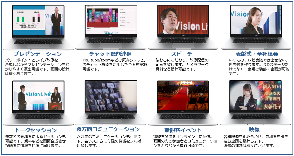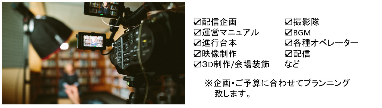 企画のみ、配信のみなどのカスタマイズも可能となっています。各種会場の設営・装飾なども対応させていただいております。