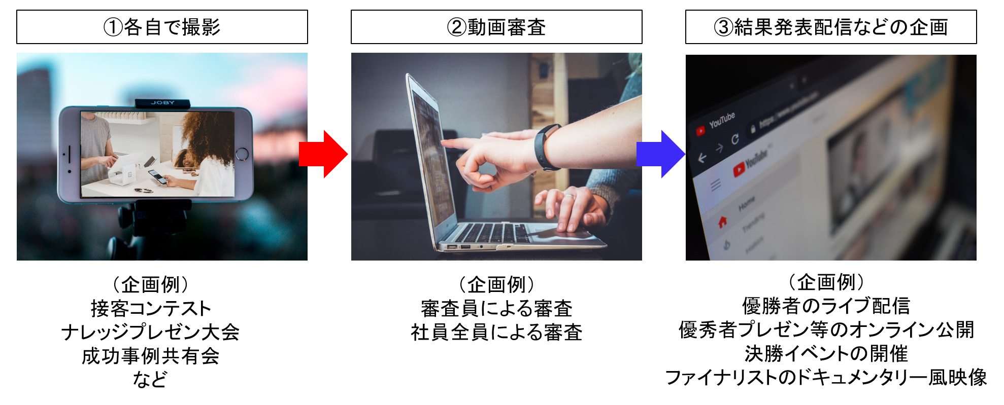 予選会を、動画エントリーで行い、審査員による審査。もしくは社員全員による投票で審査。