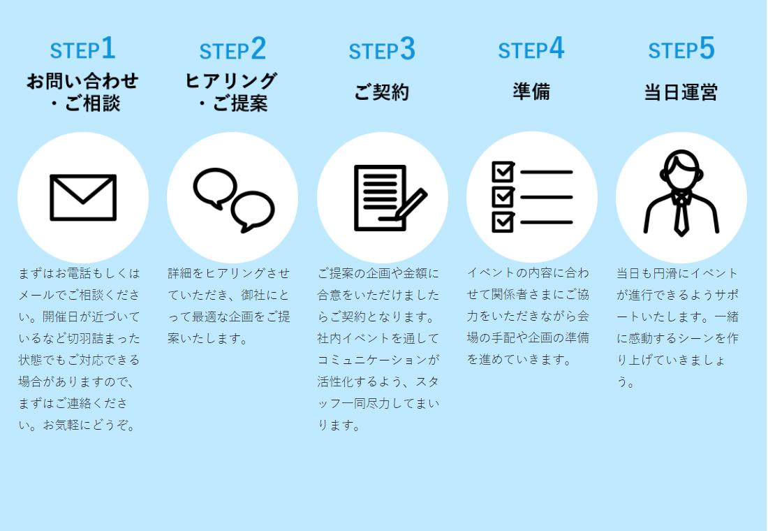 当社は、社内イベント担当者様の思いを実現化させるプロ集団として企画をレベルアップさせるだけでなく、